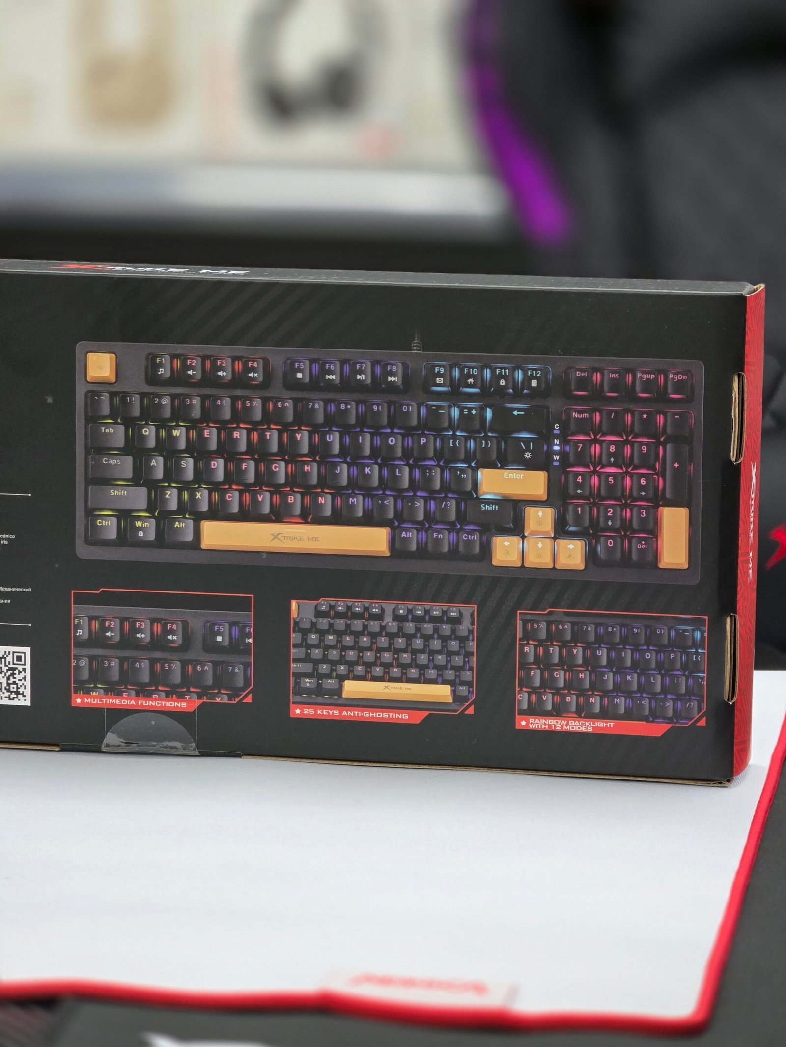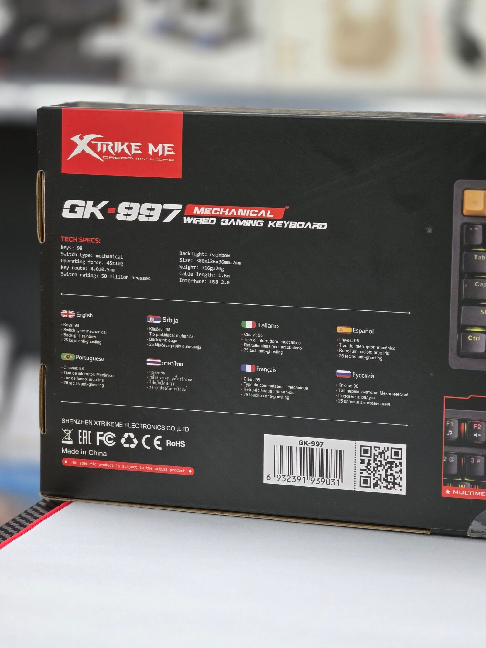 Keys: 98 Switch type: mechanical Operating force: 45±10g Key route: 4.0±0.5mm Switch rating: 50 million presses Backlight: rainbow Size: 386x136x36mm±2mm Weight: 716g±20g Cable length: 1.6m Interface: USB 2.0 Working voltage: 5V Working current: ≤200mA OS support: Windows | ||